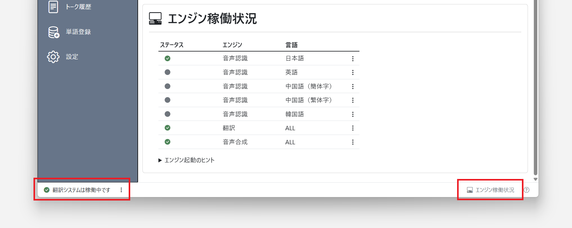 翻訳システムと各種エンジン稼働状況はウィンドウのフッターからも確認/起動の制御が可能です。